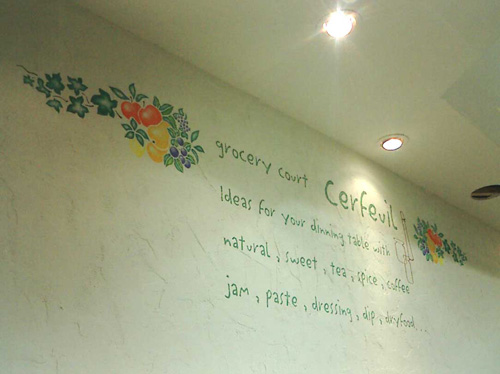●市販の照明器具に月の書き割り● ●店舗壁面にステンシルを使い描画●